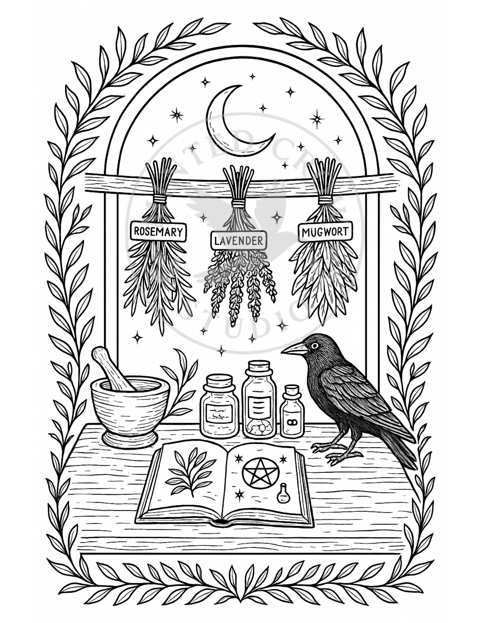 Bundles of herbs hang from twine in a quiet, spell-rich nook. This page evokes the simplicity and power of herbal magic, homecraft, and slow rituals.