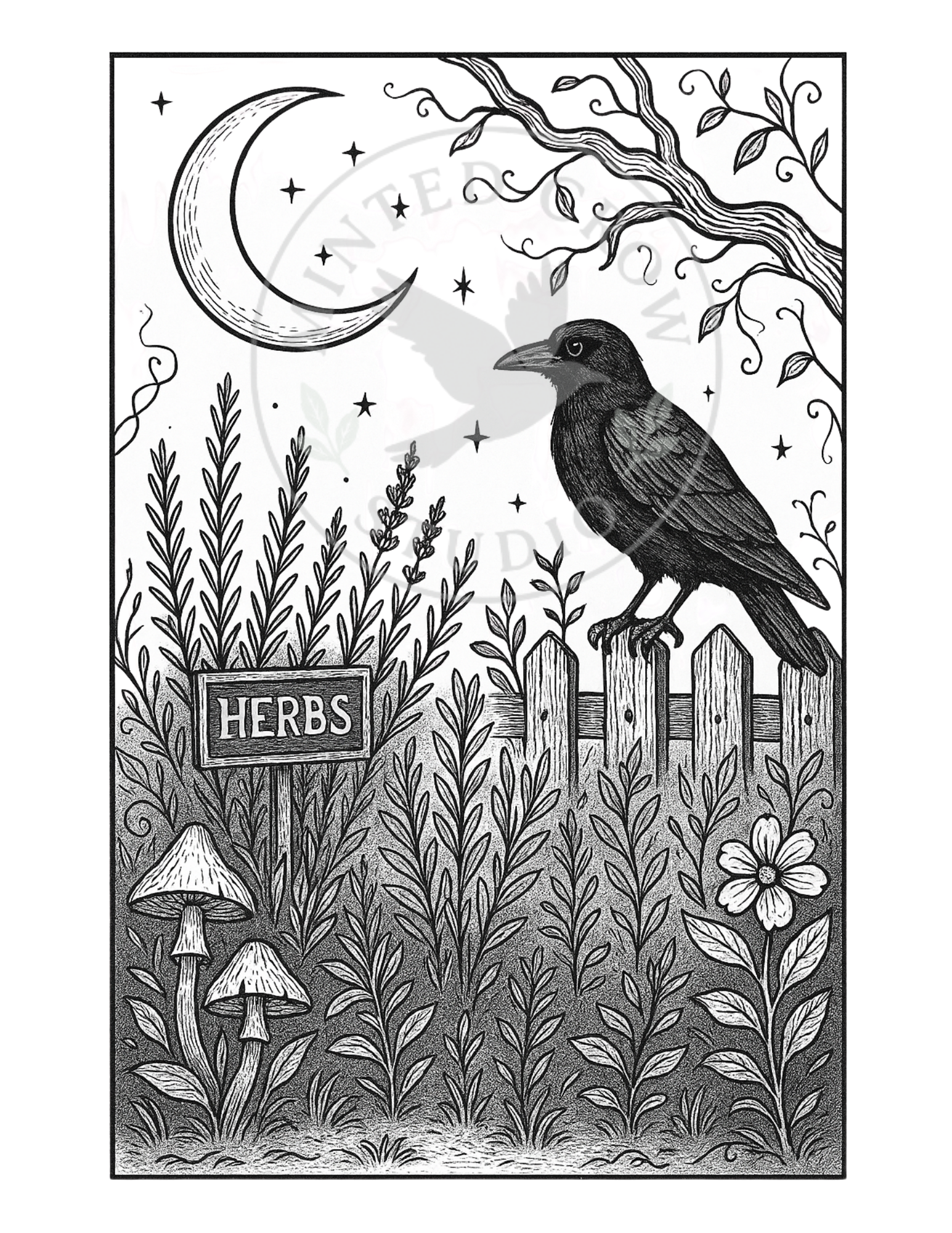 A lone crow watches from a wooden fence, wrapped in herbs and starlight. The moon hangs heavy, and the garden listens.