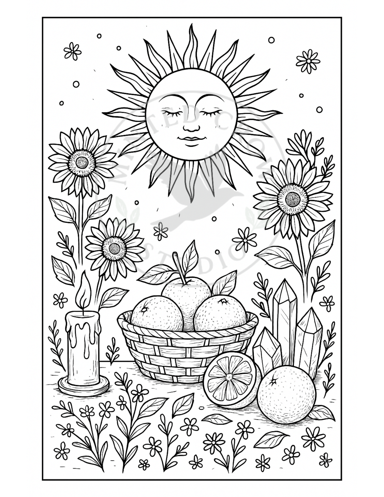 Oranges, sunflowers, and crystals gather beneath a smiling sun. Candlelight flickers beside the bounty.