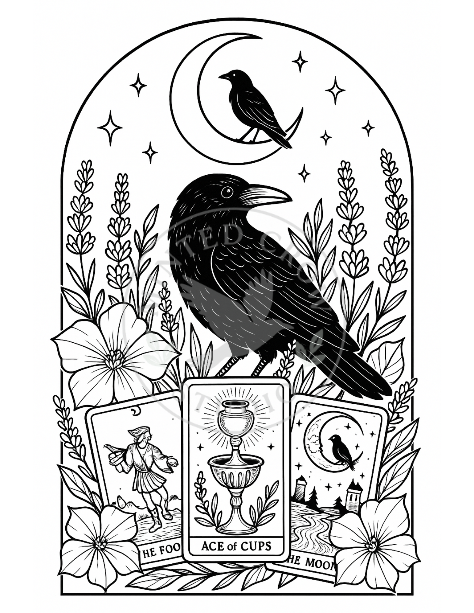 A wise crow, surrounded by tarot cards, watches with knowing eyes. This powerful familiar holds space for insight, transformation, and divination.