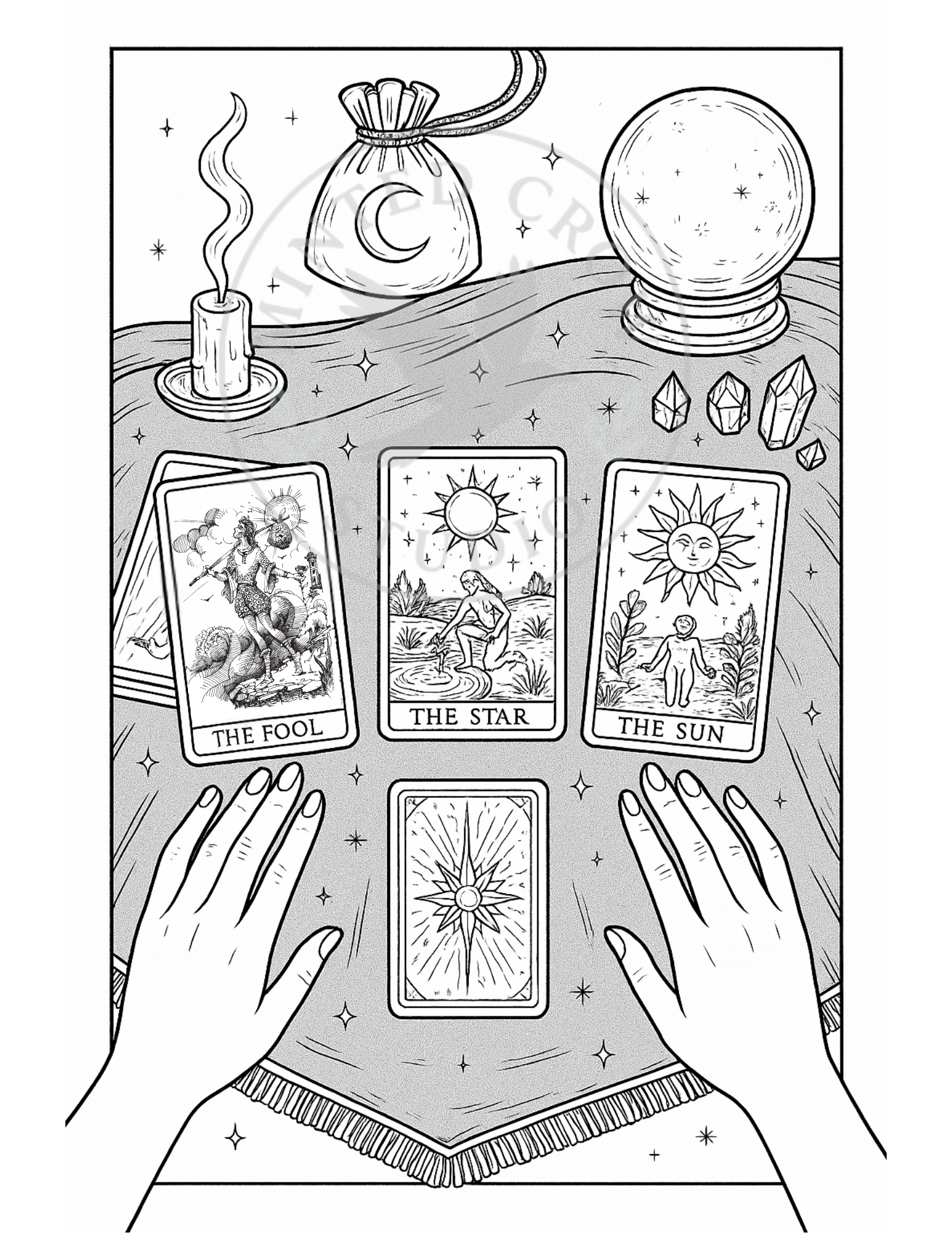 Hands hover over a glowing spread—the Fool, the Star, the Sun.