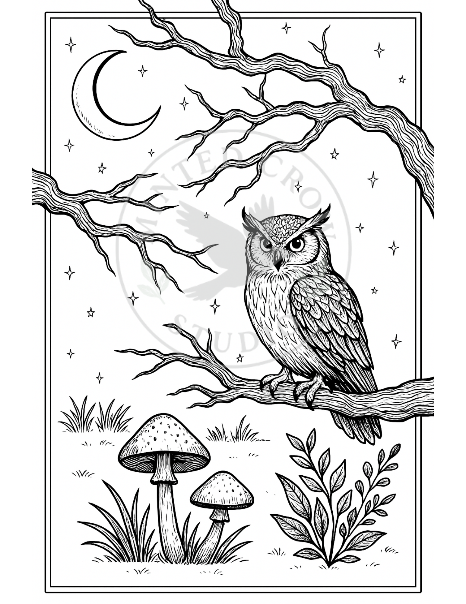 Under a crescent moon, an owl perches in silence—guardian of the dusk. Stars shimmer, but nothing stirs. The space between worlds, where wisdom wakes.