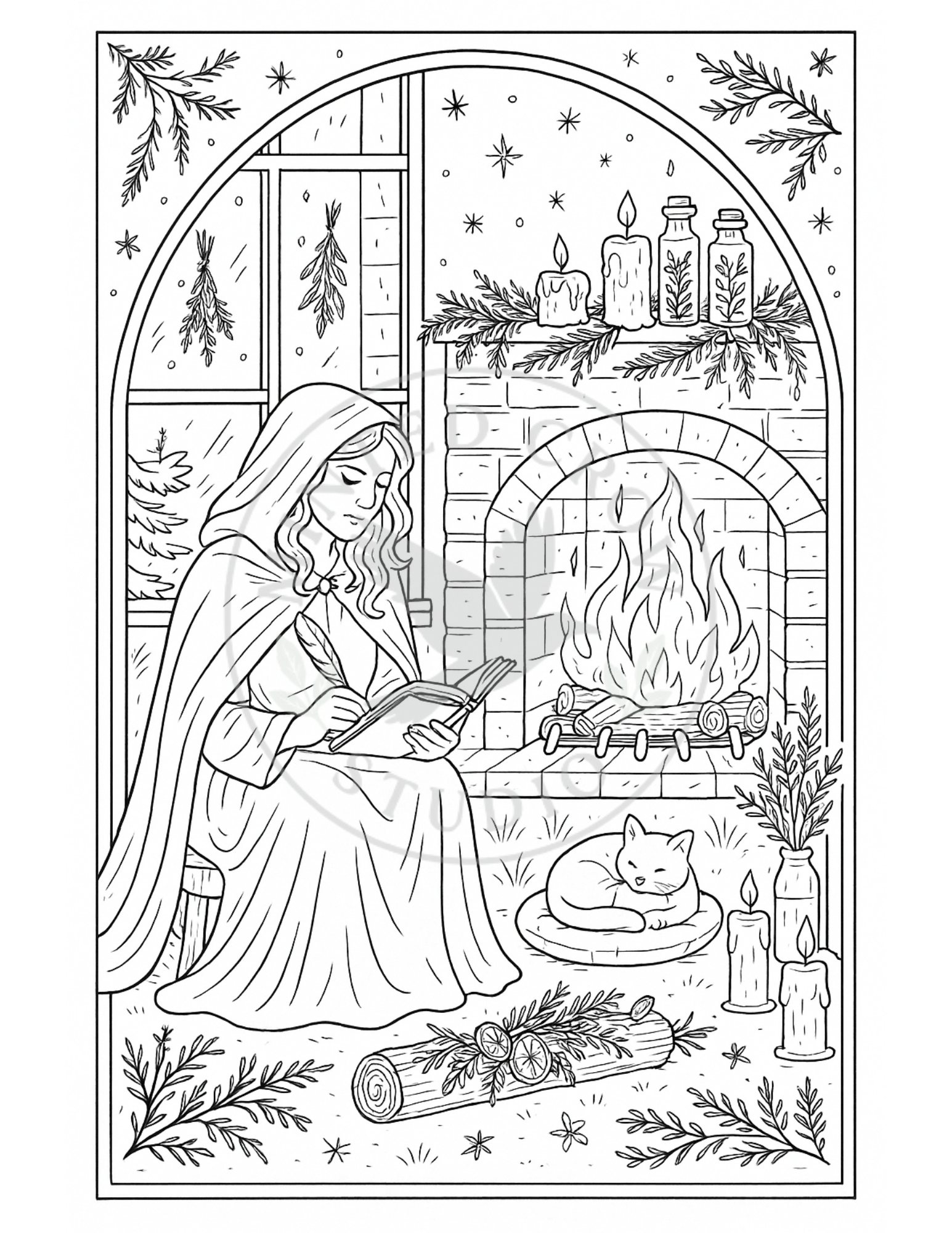 Flames dance nearby. A yule log wrapped in evergreen and citrus provides focus for a witch's intentions, and a feline familiar curls beside them.